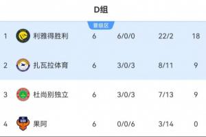 积分榜方面:利雅得胜利6战全胜,积18分小组头名出线!扎瓦拉体育3胜3负积9分,依靠净胜球优势力压杜尚别独立出线;果阿6场全败0分淘汰。