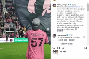 韦甘特社媒写道:“非常感谢迈阿密国际足球俱乐部,让我度过了这些美好的时光。同时也要感谢球队的装备管理员、医疗团队、教练组、管理层以及每一位默默付出的工作人员。”