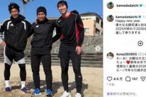 体育资讯1月2日讯 日本国脚镰田大地更新社媒,晒出自己在元旦和两名老将香川真司、长友佑都一同在海边训练的照片。