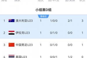 首战U23国足0-0战平伊拉克U23,因黄牌数量更多暂居小组第三;而澳大利亚U23则2-1击败泰国U23,暂时占据本组第一的位置。