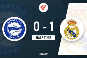 上半场伤停补时2分钟,半场结束,皇马暂1-0阿拉维斯。