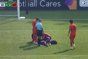 体育资讯01月17日讯 U23国足vs乌兹别克斯坦第9分钟,乌兹别克斯坦U23连续角球进攻后,李昊躺在地上接受治疗!