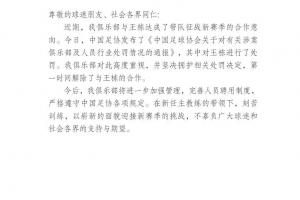近期,我俱乐部与王栋达成了带队征战新赛季的合作意向。今日,中国足协发布了《中国足球协会关于对有关涉案俱乐部及人员行业处罚情况的通报》,其中对王栋进行了处罚。我俱乐部对此高度重视,并坚决拥护相关处罚决定,第一时间解除了与王栋的合作。