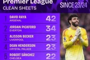 近3个赛季英超零封榜:拉亚42次、皮克福德34次、阿利松23次