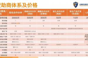 云南玉昆公开招商:冠名赞助商3000万元,其余各档赞助10万-500万现阶段能够确认的信息主要集中在以上内容。