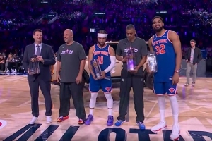 体育资讯2月15日讯 洛杉矶全明星单项赛今日进行,第二项比赛是投篮之星,决赛由卡梅隆队(杰伦·约翰逊、克尼佩尔、马盖蒂,三人均来自杜克大学)对阵尼克斯队(阿兰·休斯顿、唐斯、布伦森),率先登场的卡梅隆队神准命中3记四分球拿下38分,顶住压力的尼克斯队表现更加凶猛,他们各种狂轰乱炸直接抢下47分夺冠。